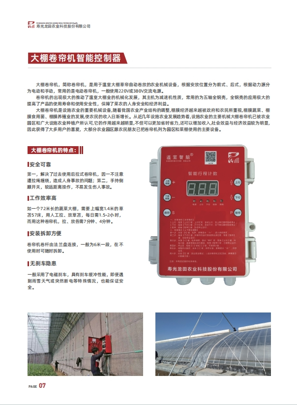 寿光龙田农业科技股份有限公司于2014年创立于“蔬菜之乡”----山东寿光。公司立志用科技服务三农,以帮助农业企业和个人提高农业生产率,协助农业企业和个人生产健康安全的高品质农产品为使命。践行“自强不息,厚德载物”的企业理念,专注于设施农业装备研发,研发生产了“温室智脑”智慧农业物联网系统、大棚智能放风机,“龙抬头”大棚运输车,“春暖花开”红外反射大棚保温被,大棚卷帘机等系列产品。公司于2017年在齐鲁股权交易中心挂牌上市,股票代码302505。